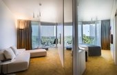 Номери та люкси оформлені у сучасному стилі з чіткими лініями дизайну, обладнані кондиціонером, телевізором із плоским екраном, міні‑баром і балконом із видом на море або парк. Це дозволяє насолоджуватися заходами сонця чи ранковою кавою в романтичній атмосфері.
